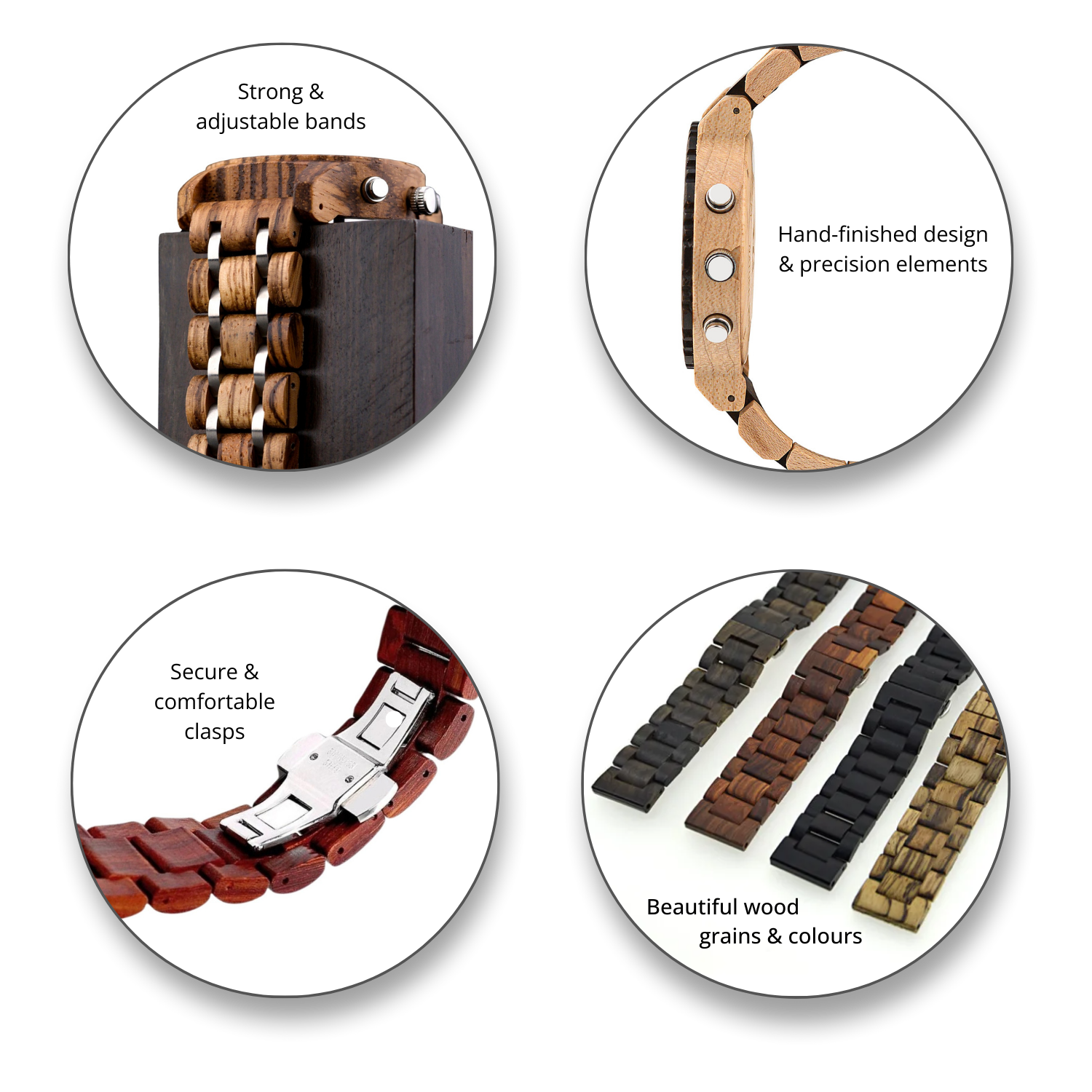 Eco-firendly & sustainable. Made using renewable resources – wood from older trees that no longer produce seeds, or from managed forests where new trees are planted to replace those harvested. Our wood watches are lightweight & have an anti-fatigue effect on the wrist during longer wear periods.