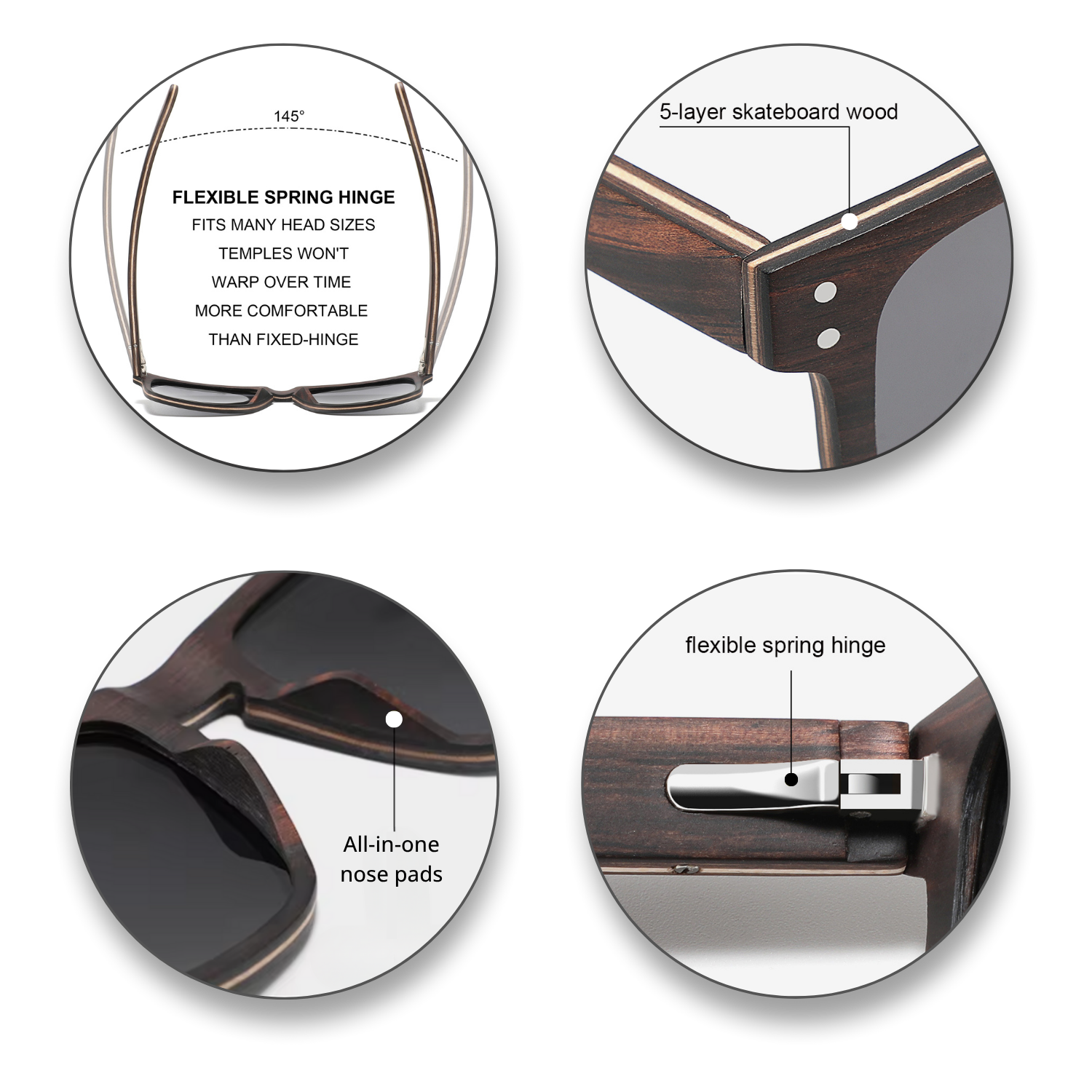A naturally beautifully material that is lightweight & comfortable. Recycled woods, bamboo & even upcycled skateboards make for a durable & tough product. Better on your skin . . . better for our planet.